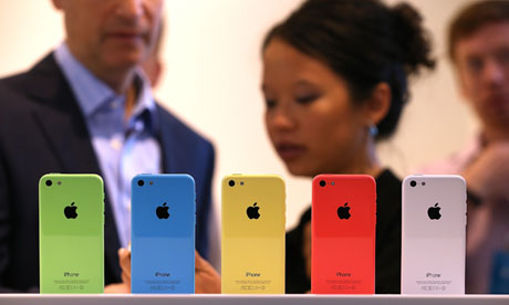 The new iPhone 5C on display in Cupertino, California during the launch. Photograph: Justin Sullivan/Getty